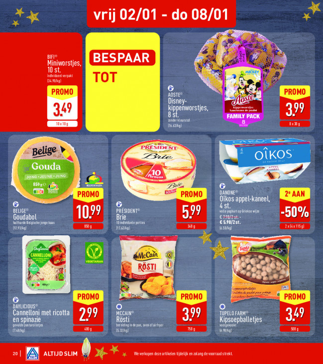 Deze tekst wordt automatisch gegenereerd, dus deze kan fouten bevatten.% vrij 02/01 - do 08/01 BIFI® = 5 ante) DOME F TOT à 6 AOSTE® PROMO NS lost kippenworstjes Fer: N Et ck 99 ETES ur hi 8200 GEB UE) me 3. ee elige EE OIKOS KL 3 I a RIO, Zn Mi . % & F 7 (ein) à PROMO u 2 PROMO Basar, ZAAN BELIGE® 99 Goudabol LL HA volle ie Griekse wijze -50% NAE) halfharde Belgischejonge kaas EN LT) DC ER CU) €5.98/2st. ETAT 1 dà FA) re € RÖSTI 2 Qi “ ” 2 = PROMO DAYLICIOUS® Cannelloni met ricotta LOTS 99 TUPELO FARM® 49 en Spinazie VA) St m) gevulde pastarollejes en RIT) bereidingin de pan, oven ofairfryer 709 LULU Kipsoepballetjes 5009 20 | ALTIJD SLIM i] x + PL CU UE COTE CE