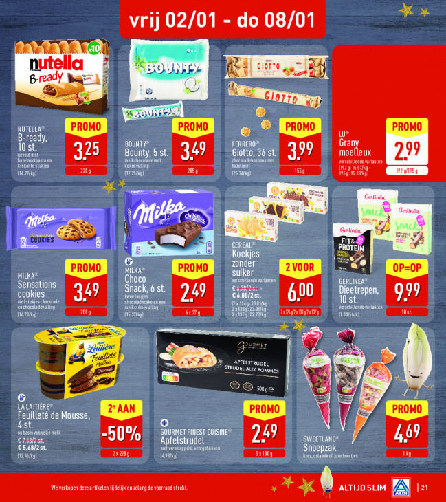 Deze tekst wordt automatisch gegenereerd, dus deze kan fouten bevatten.Ex vrij 02/01 - do 08/01 Kn FES utella dh U 117 Le Ri B-ready 2 wu io RTS LEE PR PROMO B-ready, [rs 10 st. Ets HT Grany gevuld met Bounty, Giotto, 36 st LEE LEE 925 rt "ET CAT TT 399 verschillende varianten 299 AE NON UT eu) en CAT) En CT) 1559 Kir} Er Gel tata Ay Ge Gi >) as ce 5 |. conne AS k Gerlinde, Las 2 TEL CLS Koekjes zonder ge PROMO MILKA® PR 0 suiker OP=OP LINSE verschillende varianten GERLINEA® Sensations Snack, 6 st. FD cookies RENE €6.00/2st. II metstukjes chocolade 349 chocoladecake on een 249 Lan KOUD a 9 99 enchocoladevullng 2089 TREE ATRAN WT HET] Ja varlanten LE LE) CRI Der Doom) LE = 2. TN wd, jene ä zulle Hoi APFELSTRUDEL Dr gs STRUDEL AUX POMMES > N SE] De 500ge a Se NRN Feuilleté de Mousse, GO N op basis van volle melk 50% GOURMET Ft QUISNE® URN Dd 69 FEITEN 7.8/2 st. NASE ar € 5.68/2st. ra} met verse appels, voorgebakken EN noepzak tk (UA TE) ers, colamix of zure beertjes We verkopen deze artikelen tijdelijk en zolang de voorraad strekt à 4 | ALTIJD SLIM (El