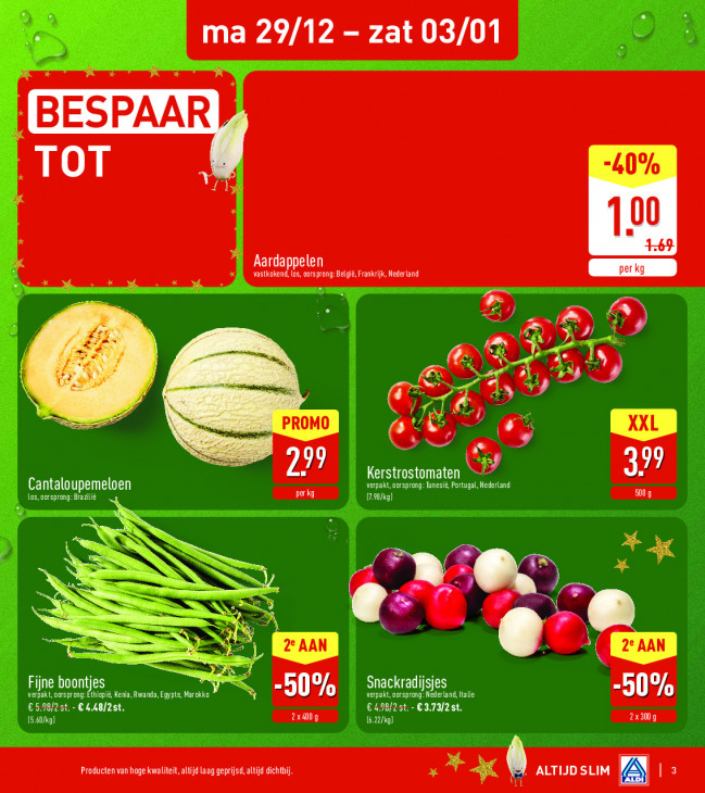Deze tekst wordt automatisch gegenereerd, dus deze kan fouten bevatten.ma 29/12 - zat 03/01 BESPAAR TOT {1 00 Aardappelen vastkokend, ls, oorsprong: Belgë, Frankrijk, Nederland = B VN er LA @ zi TT TT NS ee LE 2 van (ste Ni 99 Kerstrostomaten eo 399 Cantaloupemeloen LRU verpakt, oorsprong: Tunesië Portugal, Nederland 500g tere} EN [24:19] = GE a D Ne eg a Zn Ca 4 Rt nn “ m u Bi Le DU tjes N 50% Snackradijsjes 50% verpakt, oorsprong: thiopië, Kenia, Rwanda, Egypte, Marokko verpakt, oorsprong: Nederland, tale. TES ERLE €448/2st. 2x400 q CAES 498/2st. €3.73/2st. PEUT (5.40/kg) CP) Producten van hoge kwaliteit, altijdLaag geprijsd, alt dichtbi | ALTIJD SLIM A