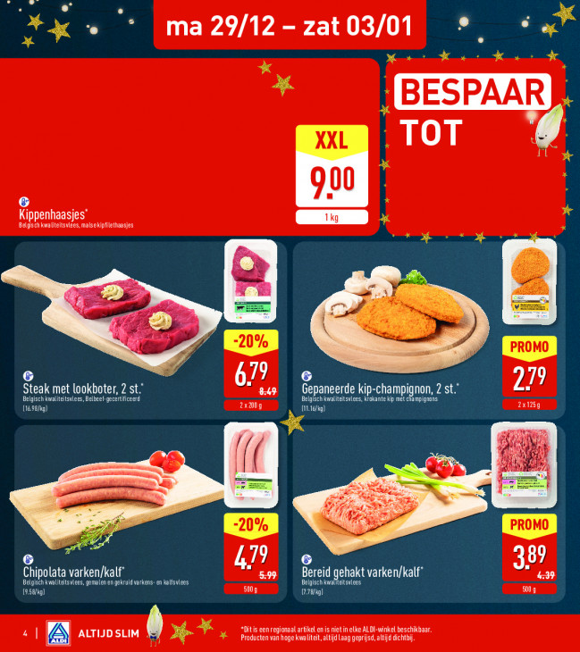 Deze tekst wordt automatisch gegenereerd, dus deze kan fouten bevatten.EE Li CI ma 29/12 - zat 03/01 LR LS Zu RER EE LS ESPAA N ET iu N © Kippenhaasjes‘ Belgisch kwalteitsvees, malsekipfilethaasjes GED lune. © nr. > = ie E Zul zaet 679 6 79 Steak met lookboter, 2 st.” Le Gepaneerde kip-champ! ignon, 2 st. Belgisch kwaliteitsvlees, Belbeef-gecertiiceerd BR Belgisch kwaliteitsvees, krokante kip met champignons ke AT 12279] RE) CS Bi nt, 62 if 4 89 137) Chipolata varken/kalf 5-99 Bereid gehakt varken/kalf" Belgisch kwalititsvles, gemalen en gekruid varkens- en kalfsvlees 500g Belgisch kwaltteitsvlees 5009 [62779] RAGE ca Producten van hoge kwaliteit, altijd Laag geprijsd, altijd dichtbij. “Ditis een regionaal artikel en is niet in elke ALDI-winkel beschikbaar. ALTIJD SLIM 0) no #