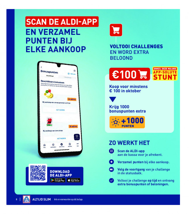 Deze tekst wordt automatisch gegenereerd, dus deze kan fouten bevatten.EN VERZAMEL D PUNTEN BIJ VOLTOOI CHALLENGES ELKE AANKOOP EN WORD EXTRA BELOOND Bonuspunten Beschktanr Beschi Koop voor minstens € 100 in oktober 5 Bij aankoop van vers grsunten en teu v Krijg 1000 bonuspunten extra ÉD . e ZO WERKT HET a mr una rn = © Scan de ALDI-app aan de kassa voor je afrekent. Verzamel punten bij elke aankoop. DOWNLOAD Volg de voortgang van je challenge in de statusbalk. DE ALDI-APP CEN EE 6 600 Voltooi je challenge op tijd en ontvang extra bonuspunten of beloningen. s | ALTIJD SLIM _ Info en voorwaarden op aldi.be/app