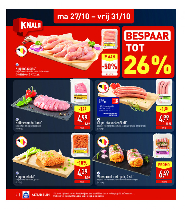 Deze tekst wordt automatisch gegenereerd, dus deze kan fouten bevatten.ma 27/10 — vrij 31/10 KNALDI se BE PAA € de u TOT 5 0% Kippenhaasjes” Belgisch kwaliteitsvles, malse kipfilethaasjes Rrk RIEN 2 ” me EN Ze TA > “a > > CR + bn 99 EEE Chipolata varken/kalf* 49 kalkoenfilet in medaillons gesneden Eur) Belgisch kwaltetsvlees, gemalen en gekruid varkens- en kalfsvlees 5009 [1120] AR) "tr Pr a — A D > aa m > 6 PE = 4 Kippengehakt” 539 Vleesbrood met spek, 2 st. N Beigisch kwafteitsvlees, gekruid Air Belgisch kwalitetsulees, varkensvleesbroodjes metspek 23009 1.3210) U) “Ditis een regionaal aanbod. Ontdek of jouw favoriete ALDI vers vees verkoopt op aldi.be/versulees. ca ALTIJD SLIM Producten van hage kwaliteit, altijd Laag geprijsd,altjd dichtbij A