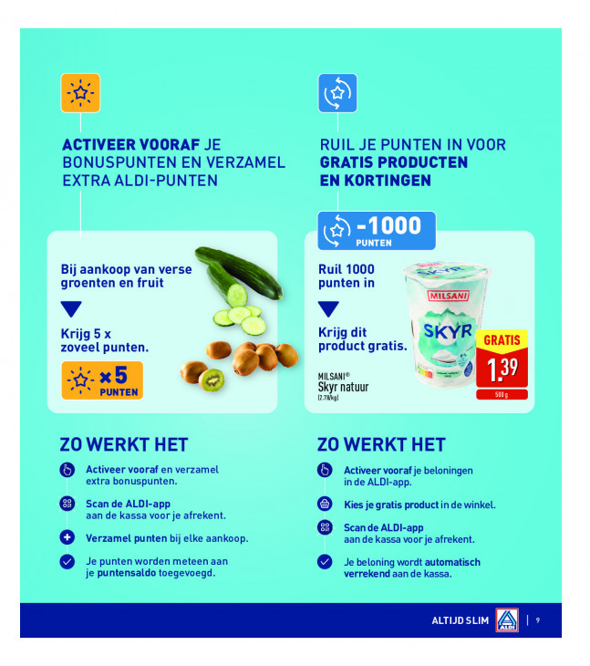 Deze tekst wordt automatisch gegenereerd, dus deze kan fouten bevatten.# 6 ACTIVEER VOORAF JE RUIL JE PUNTEN IN VOOR BONUSPUNTEN EN VERZAMEL GRATIS PRODUCTEN EXTRA ALDI-PUNTEN EN KORTINGEN A LU PUNTEN ee Bij aankoop van verse Ruil 1000 =. groenten en fruit punten in v L4 à Krijg 5 x Krijg dit | SKYR zoveel punten. product gratis » 500 iS MILSANI® Be % [2279] Skyr natuur ae ZO WERKT HET ZO WERKT HET Activeer vooraf en verzamel © extra bonuspunten Activeer vooraf je beloningen in de ALDI-app. Scan de ALDI-apı Kies je gratis product in de winkel. aan de kassa voor je afrekent. Scan de ALDI-app Verzamel punten bij elke aankoop. aan de kassa voor je afrekent. ° Je punten worden meteen aan Je beloning wordt automatisch je puntensaldo toegevoegd verrekend aan de kassa