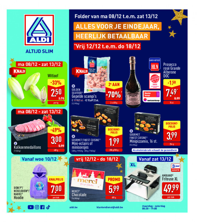 Deze tekst wordt automatisch gegenereerd, dus deze kan fouten bevatten.Folder van ma 08/12 t.e.m. zat 13/12 x ALLESVOOR JE EINDEJAAR, > a A Le ATL “Vrij 12/12 t.e.m. do 18/12 ALTIJD SLIM Fe TE) A) HLN rosé Grande NALDI Alberone Witloof -33% GE 2025 2° AAN ED 2 GOLDEN hi SEAFOOD LL Dd LH & pelde sc ampi's 11.6912 st. © kostoankoop 71 = Ten 2x450g LT ma 08/12 - zat 13/12 EN | CE] Ke C2 SU Di Er > Le mo PRIJS 3" j er LU : SAINTE GOURMET FINEST a 399 00 eclairs 0 (EL 12/7] Minipizzamix, 16 st. B6g 00 RAT) TT Alcoholmisbruik schaadt de gezondheid. Kalkoe nmedaillons (mo vrij 12/12 - do 18/12 Vanaf pe 10/12 ni XL a ua KNALPRIJS AMBIANO® Friteuse XL Zes 700 MERCI® 99 | Be Chocolade Hoodie EE 7] Er w aon d aldi.be [email protected] 08:30 - maandag - zaterdag :00
