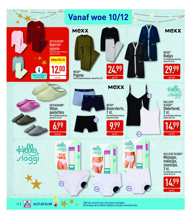 Deze tekst wordt automatisch gegenereerd, dus deze kan fouten bevatten.NEE, — I _ Vanaf woe 10/12 en MEXX ZI NE adstof- an maten 5. MEXX® Badjas schillend maten M tot eva, = E MEXX® 8 99 CO 1200 Pyjam: perset verschillende varianten, maten M tot XL perset if MEXX ZE Hd „löggi x À N HELLO BY UP2FASHION® SLOGGI® Vilten Boxershorts, verschillende varianten, pantoffels verschillende varianten, verschilende varianten, De, maten 3710t45* ‘maten tot XXL maten 38 tot r 22 ET ea «ill, ‚löggi EE Ì löggi r AN „laggi mm È HELLO BY SLOGGI® J| A fl ; inislips, ogg} midislips, Baz | me we maten 38 tot 44 verschilende varianten, 14 ie a we ®