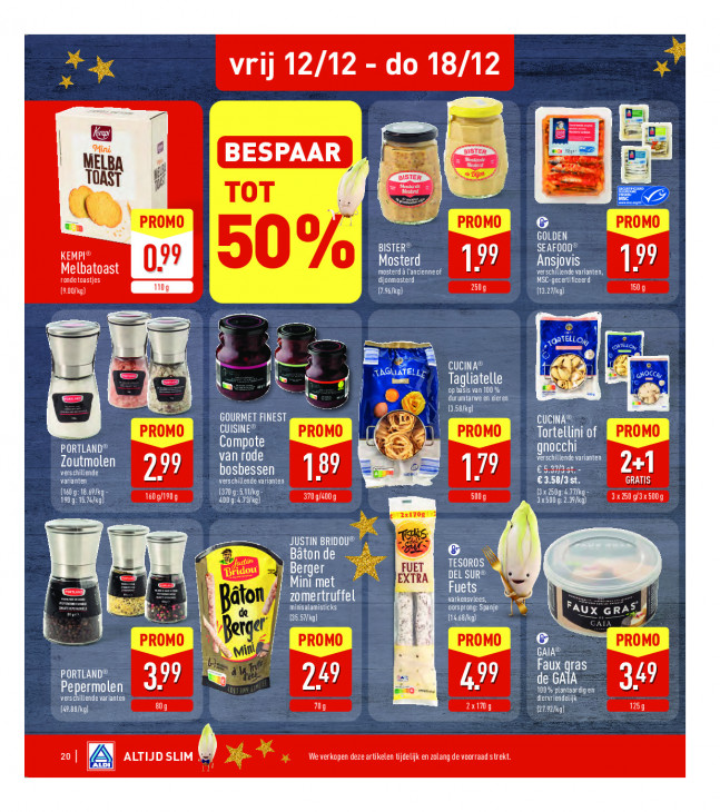 Deze tekst wordt automatisch gegenereerd, dus deze kan fouten bevatten.vrij 12/12 - do 18/12 = BESPAAR Æ MELBA Cr = TOAST = i a À Se & al) KEMPI FOR SEAFOOD® Melbatoast 99 Mosterd 199 Ansjovis 99 rondetoastjes CT mosterd à l'ancienne of verschi MSC-gecertificeerd ) ende varianten, CUT) 17.96/kg) EN LT) 1509 | 7 EUR > EN © AN pr \ [> Se Er Ik MATE 1 5 Tagliatelle Br = ENS dj OSTEN 3. durumtarwe en eieren 8 Ben) z CUISINE® GOURMET FINEST 7. of PORTLAND® Compote nn Zoutmolen van rode an varianten verschillende 299 bosbessen 189 179 FTE EREN a varianten vers chillende varianten €3.,58/3st. GRATIS PAN TA M) 1609/1909 [EHRE ETE EARN 5009 KERA EEE TI) 3x200 yaxs0ng EINE ton Berger FUET TESOROS LES Mini met EX ut icon uets | À minisalamisticks = - DD FAU GRAS OT] [il AIA Se FR Etre Faux seu 99 249 1,99 de G A re 49 Ei epermo lende varlanten 100% plantaardigen m EN 79 ur) 24200) diervriendelijk 12 iT] Pen EN ALTIJD SLIM ll We verkopen deze artikelen tijdelijk en zolang de voorraad strekt. Al